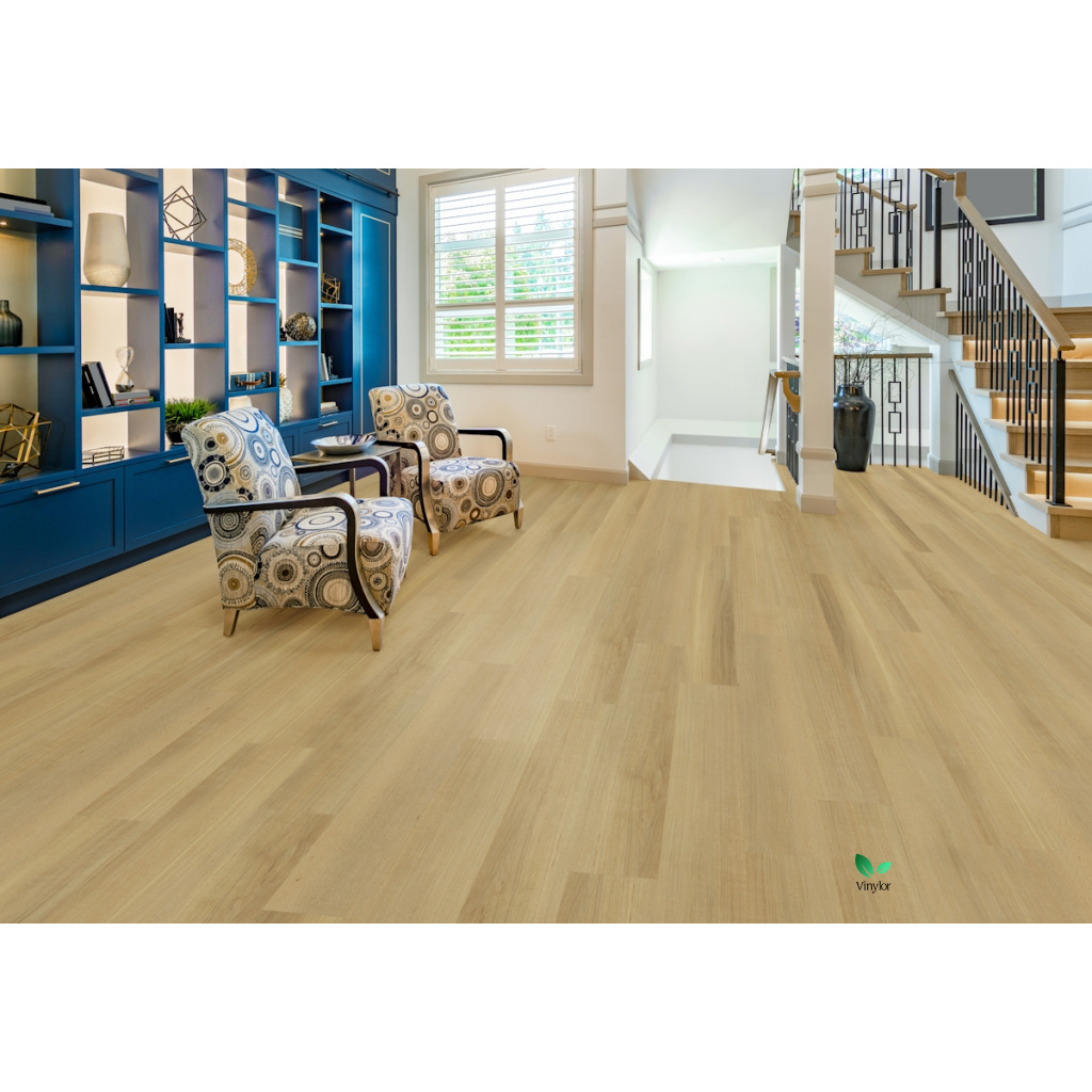 Vinylová podlaha s Click systémom, celková hrúbka 4,5 mm, z toho: nášľapná vrstva je 0,3 mm, 1 mm integrovaná podložka EVA, skosené hrany po všetkých 4 stranách. Rigidné SPC vinylové dielce