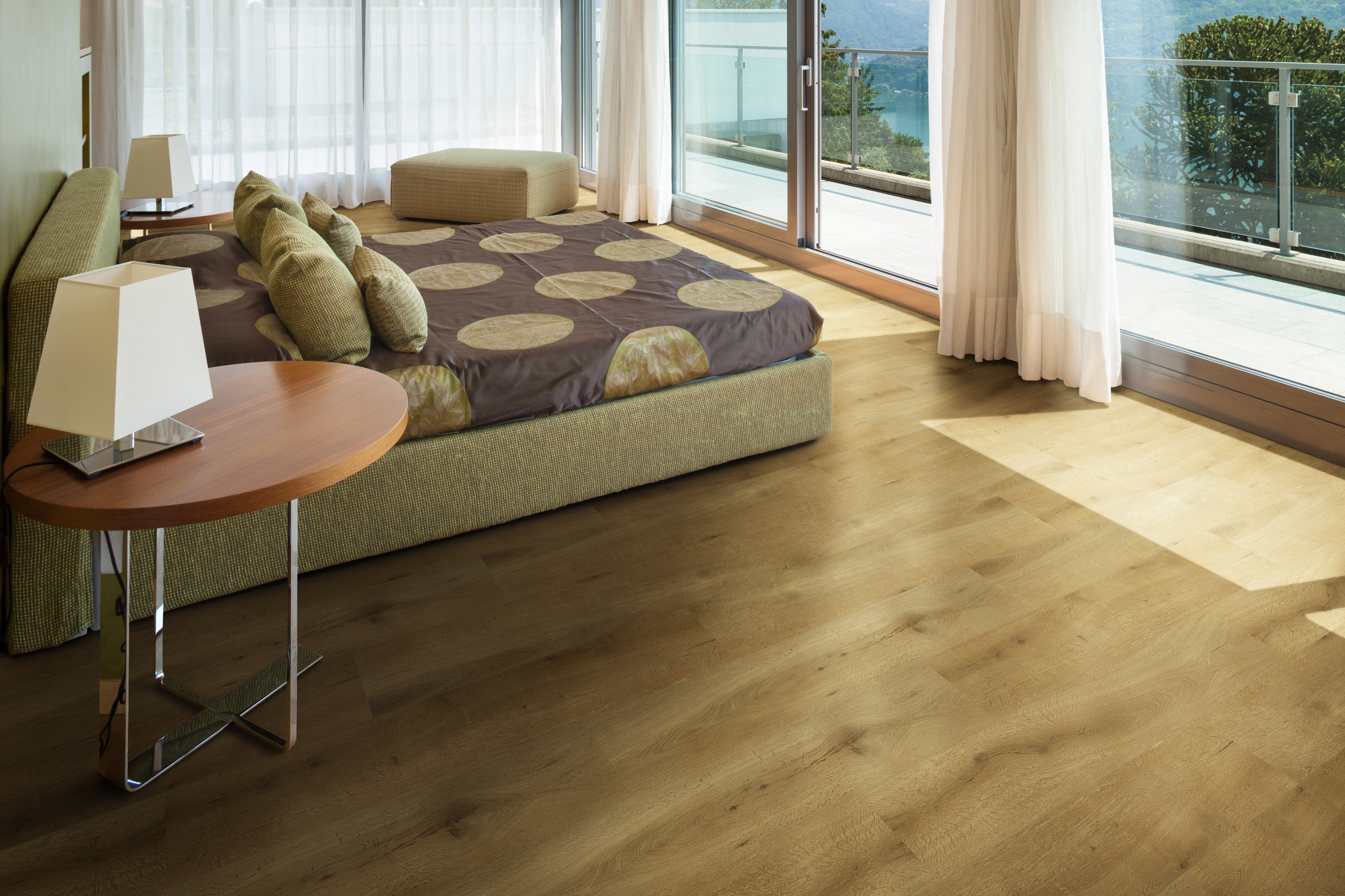 -Další vrstvu tvoří dekor určující vzhled podlahy. Na výběr máte z několika odstínů oblíbeného dubového dřeva. Světlejší tóny se hodí do menších a tmavších miestnosťí, tmavší odstíny zase skvěle zapadnou do prostorných interiérů plných světla.