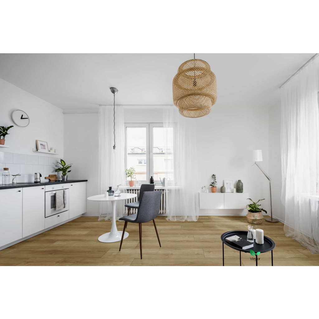 Vinylová Podlaha Rigid SPC Click Latté - s integrovanou akustickou podložkou EVA 1mm. Podlaha má na spodní straně integrovanou akustickou podložku o síle 1 mm. Není již nutné dávat dodatečnou podložku. Celková hrúbka vinylového dielce je 5 mm a nášľapná vrtsva má sílu 0,5 mm. Ideálna podlaha do bytu pro stredný i vyšší záťaž. Vinylové dielce mají dĺžku 123,5 cm a šírku 17,8 cm, skosené hrany po všetkých 4 stranách, 3D embosovaný povrch.