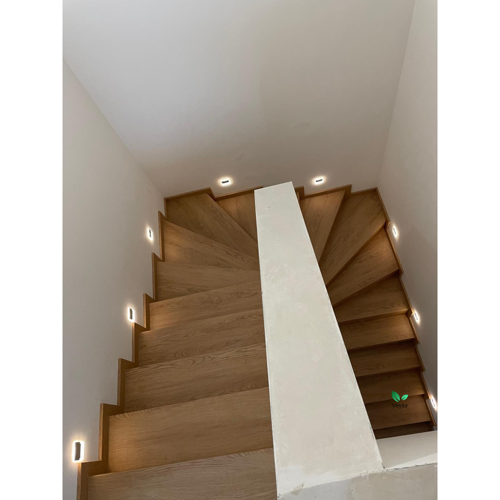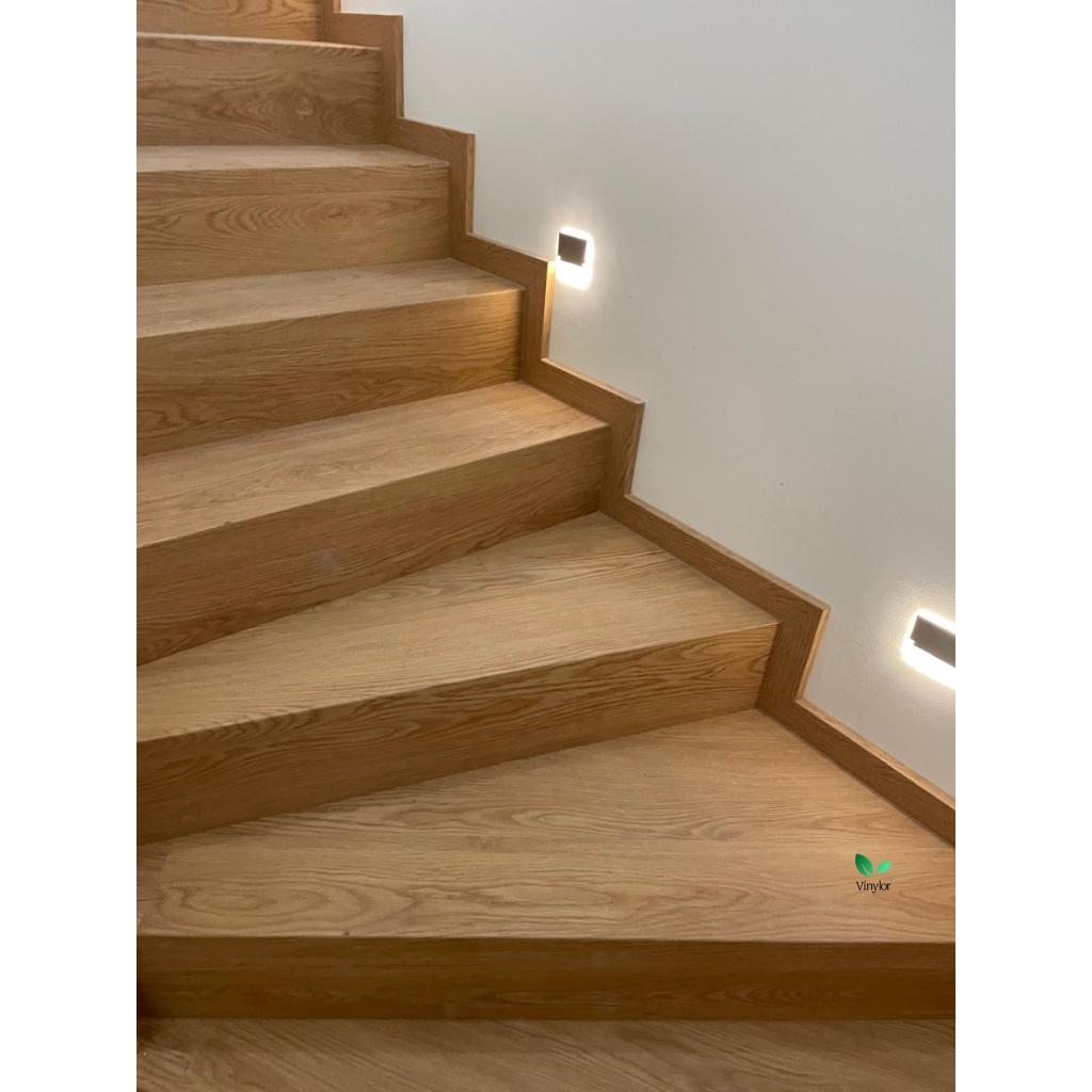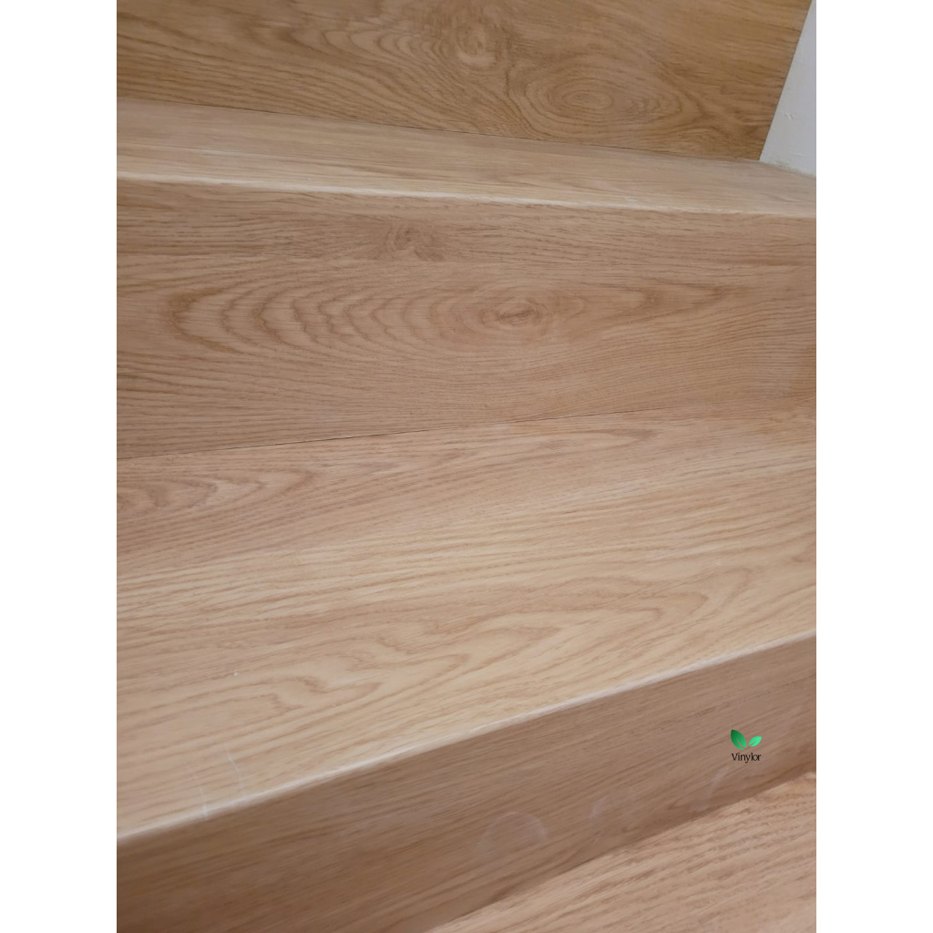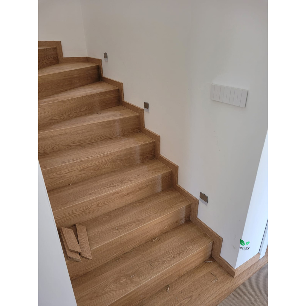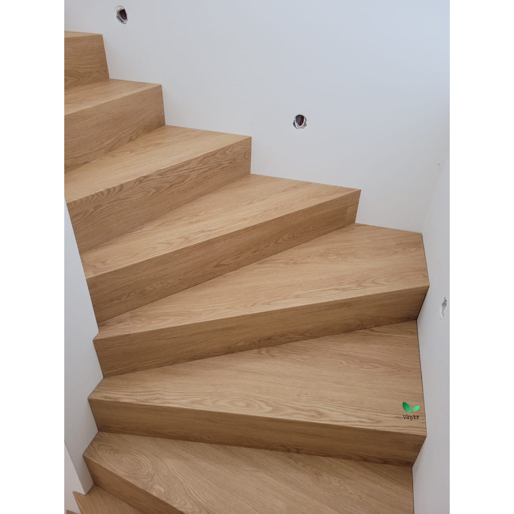 - Hrany: Vinyl se upravuje tak, aby byl perfektně ohnutý a schod působil jednolitě.